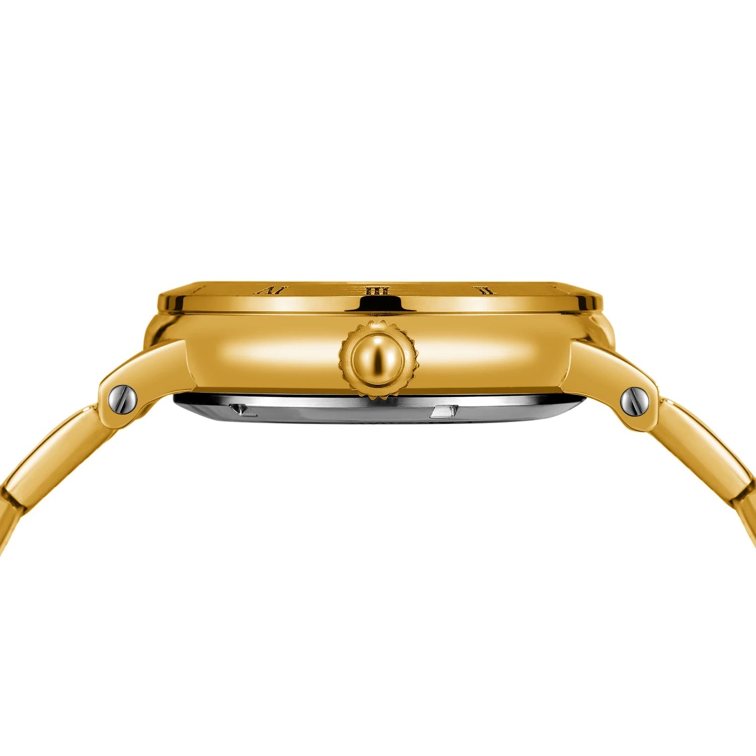 • Roman numeral hour markers on polished bezel provide classical elegance