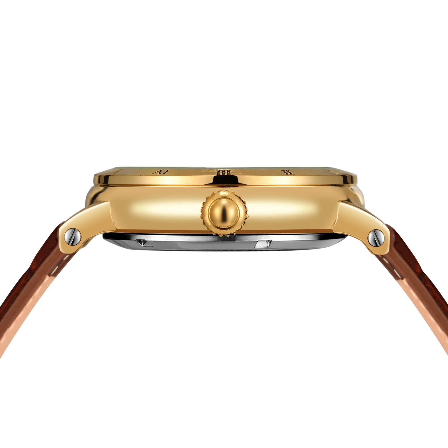 Masterful horological engineering takes center stage in this skeleton-dial timepiece, where each intricate gear and spring is meticulously revealed beneath a transparent face framed by Roman numerals. The hand-finished gold-tone case pairs with a supple crocodile-embossed leather strap, creating a distinguished statement of mechanical artistry and refined taste.