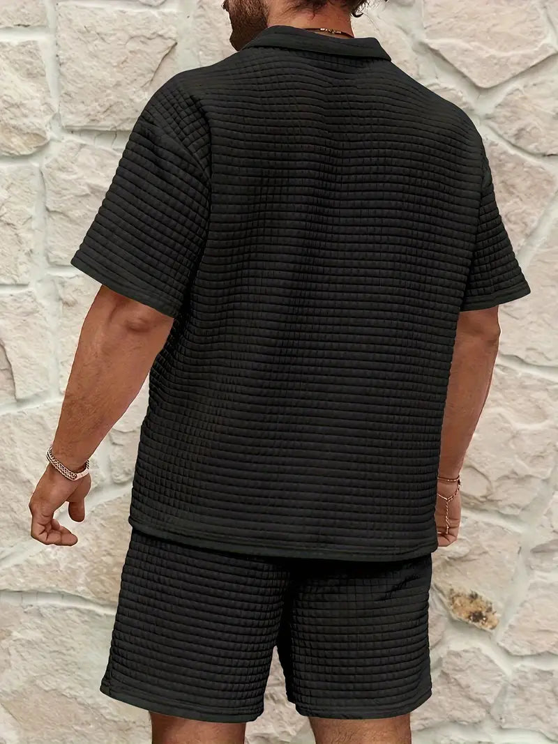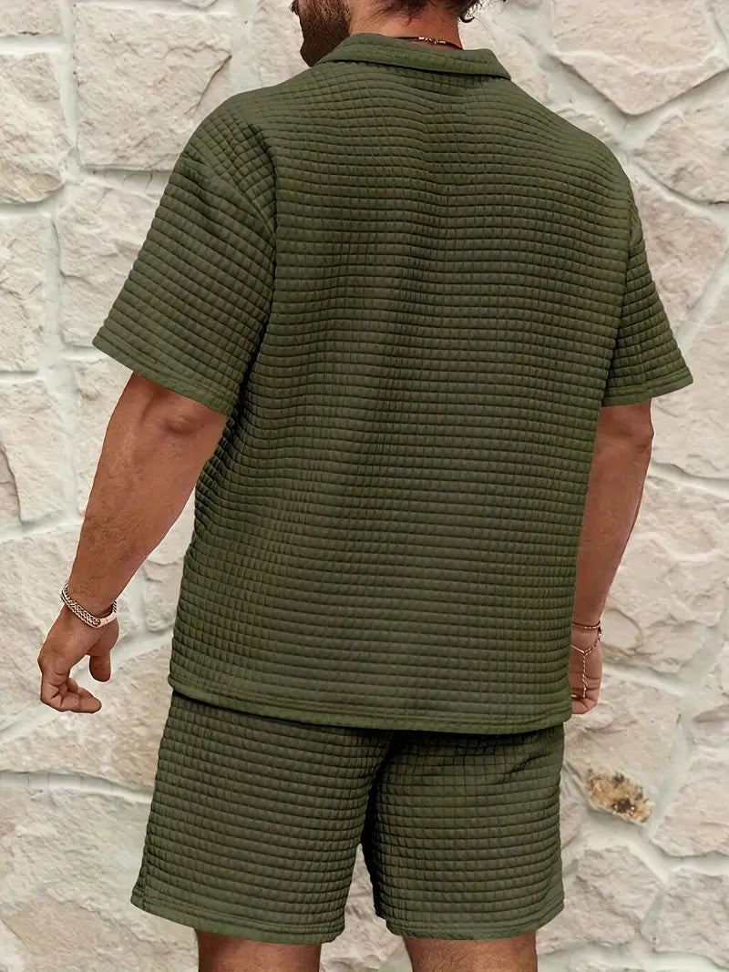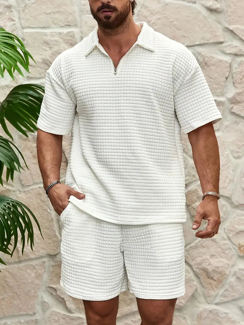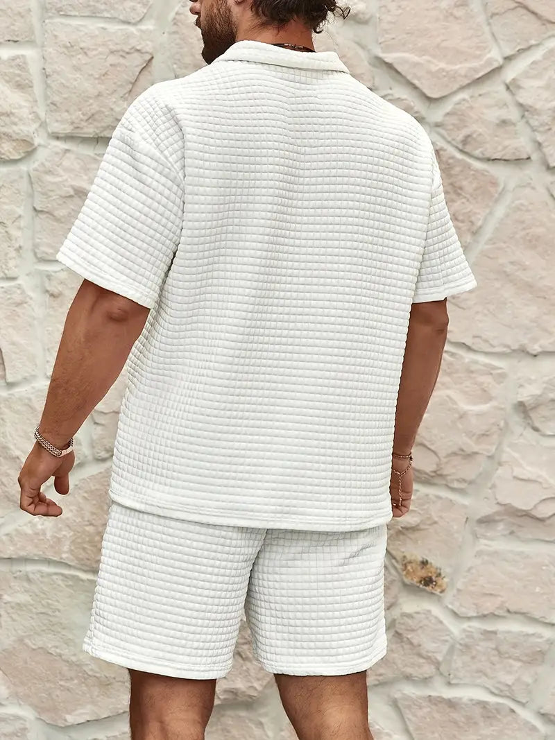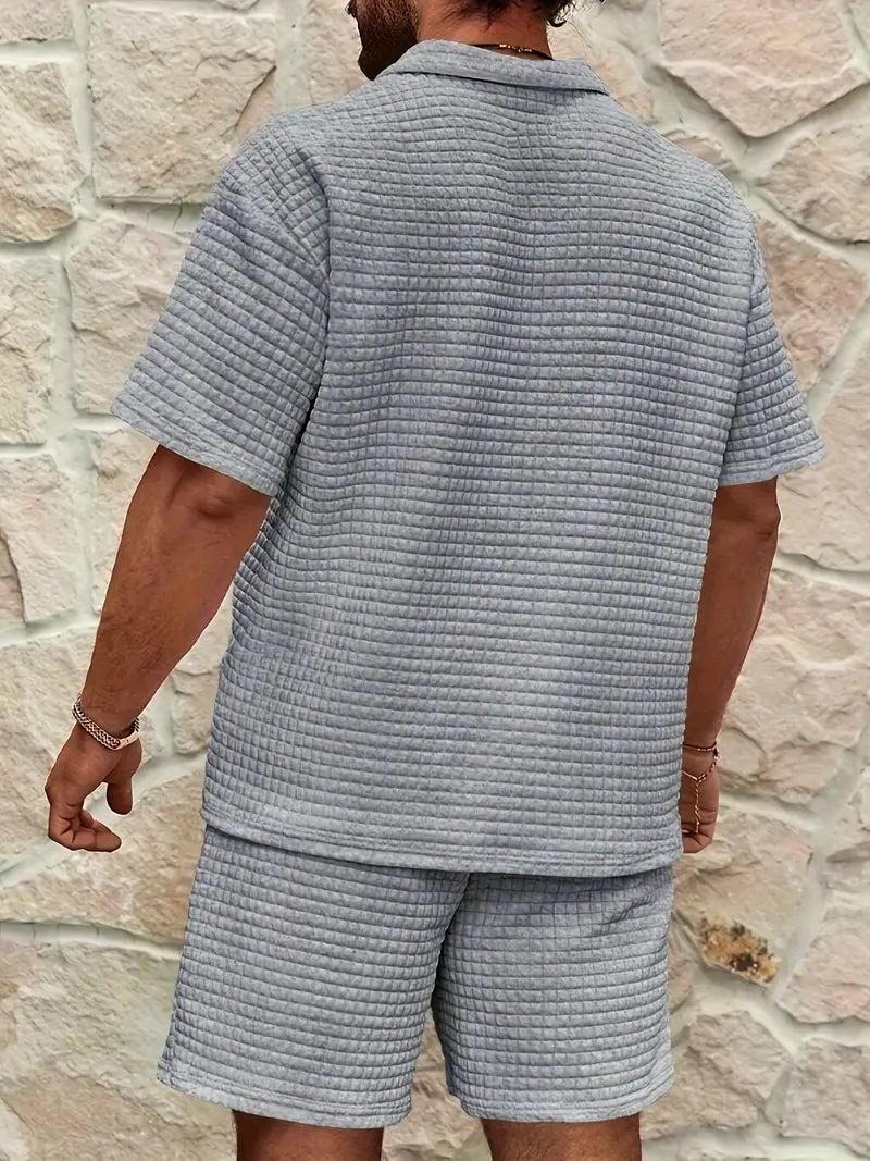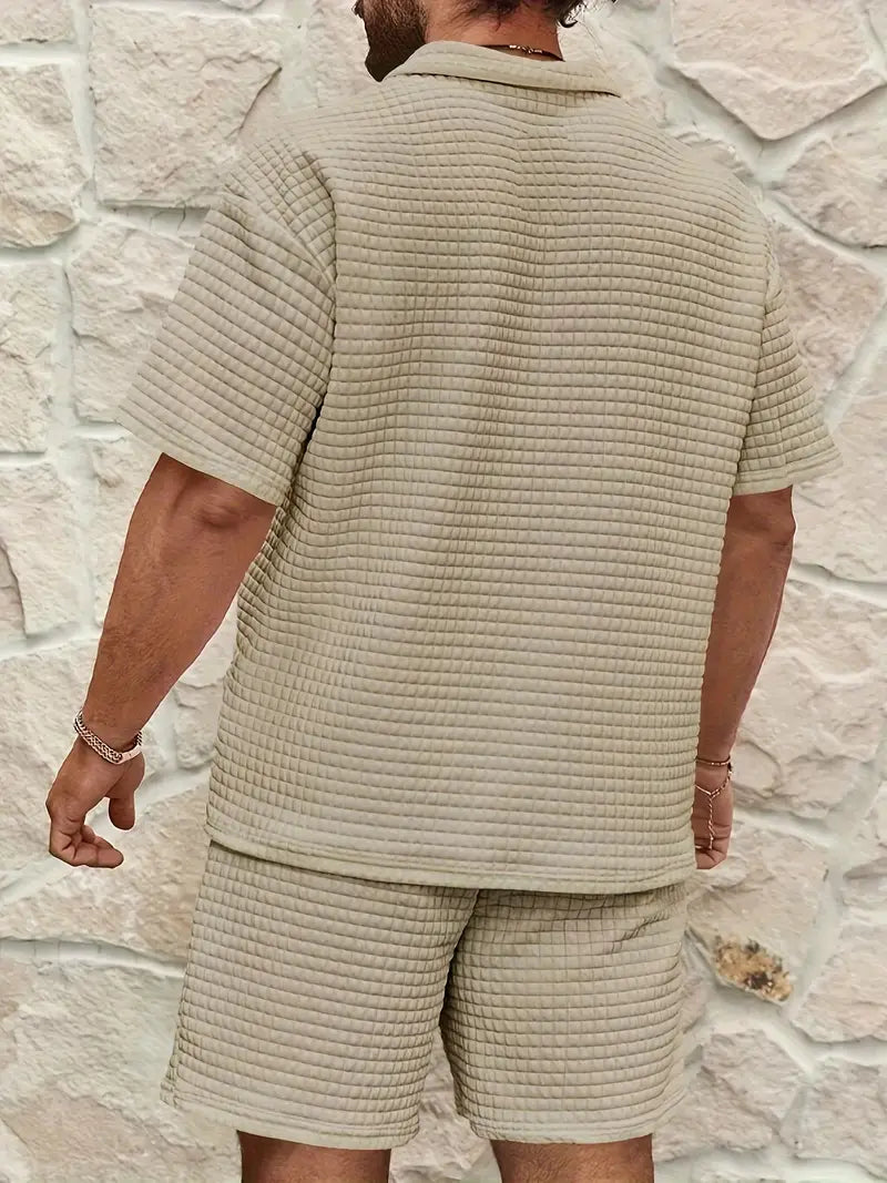 Designed for warm-weather refinement, this two-piece set pairs a textured waffle-knit finish with a relaxed, tailored silhouette that flows with your every move. Crafted from a premium cotton blend, it delivers breathable comfort and clean lines that hold their shape all day.