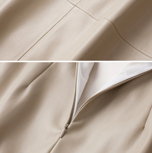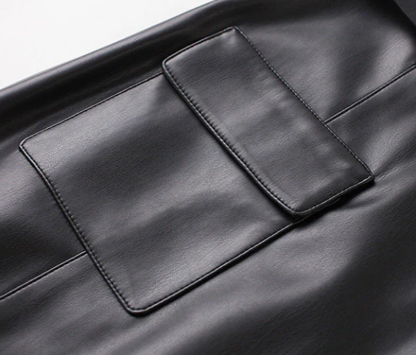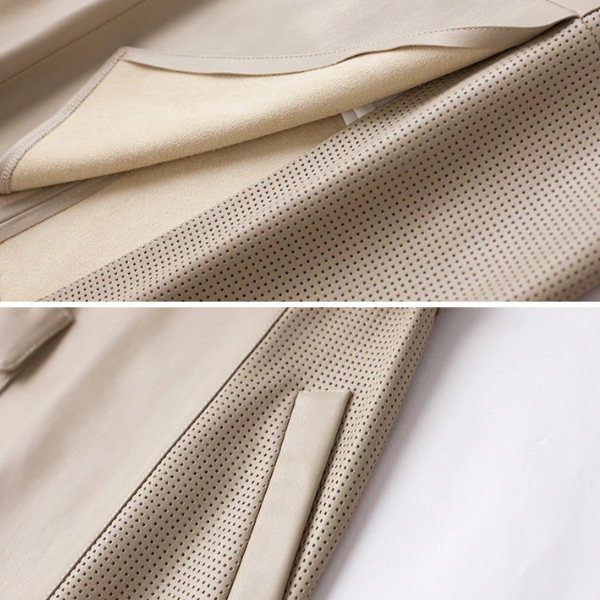 Crafted from supple sheepskin leather with a distinctive perforated mesh panel that creates subtle movement and breathability. The asymmetric cargo pocket adds functional edge, while the adjustable buckle belt cinches the waist for a customized silhouette.