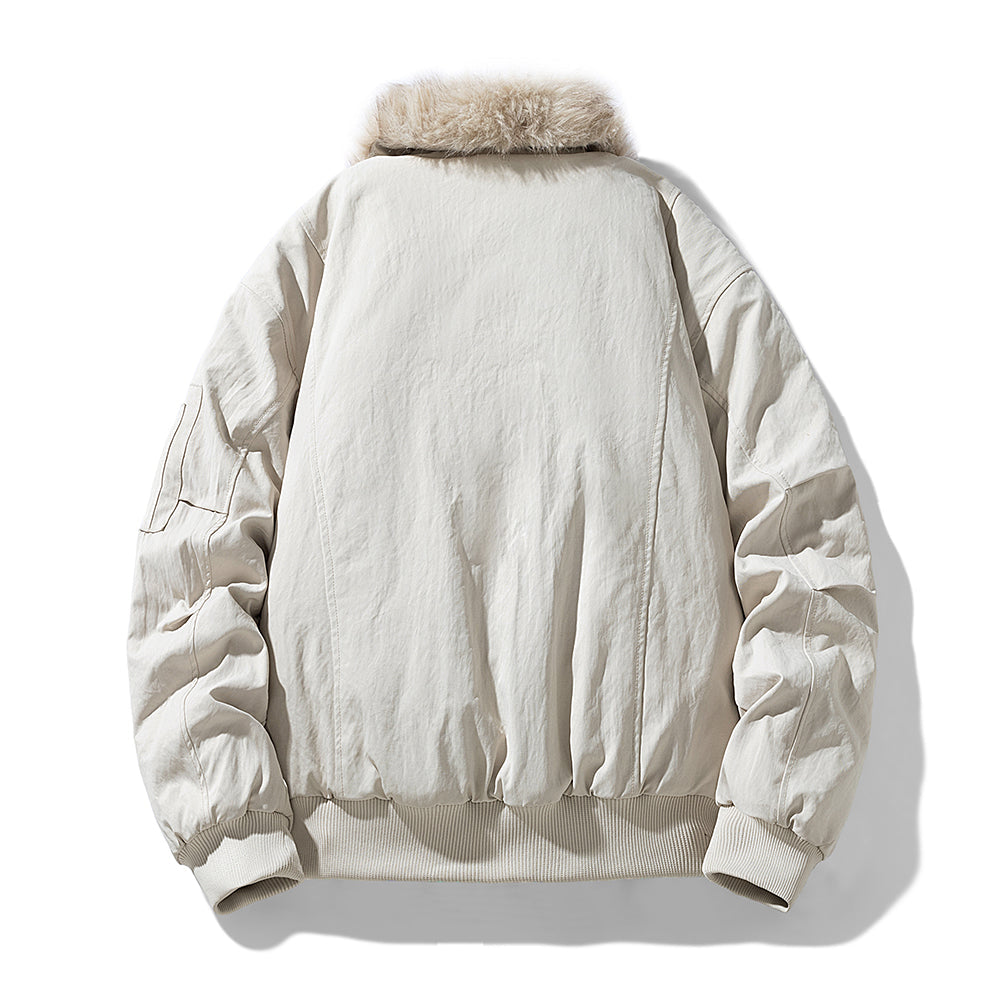 This is outerwear architecture at its finest. The Sovereign Aviator draws from Cold War flight heritage, reimagined through a contemporary luxury lens. Its shell is constructed from technical cotton twill with a water-resistant finish, while the interior reveals a revelation: sumptuous faux-fur lining in Arctic cream that transforms utilitarian design into tactile indulgence. The oversized fur collar—a signature that announces arrival—can be styled up for maximum impact or folded down for understated elegance. Every detail speaks to purposeful design: the MA-1 inspired arm pocket with silver-tone hardware, ribbed cuffs and hem for wind resistance, and a relaxed bomber silhouette that layers effortlessly over tailoring or knitwear.