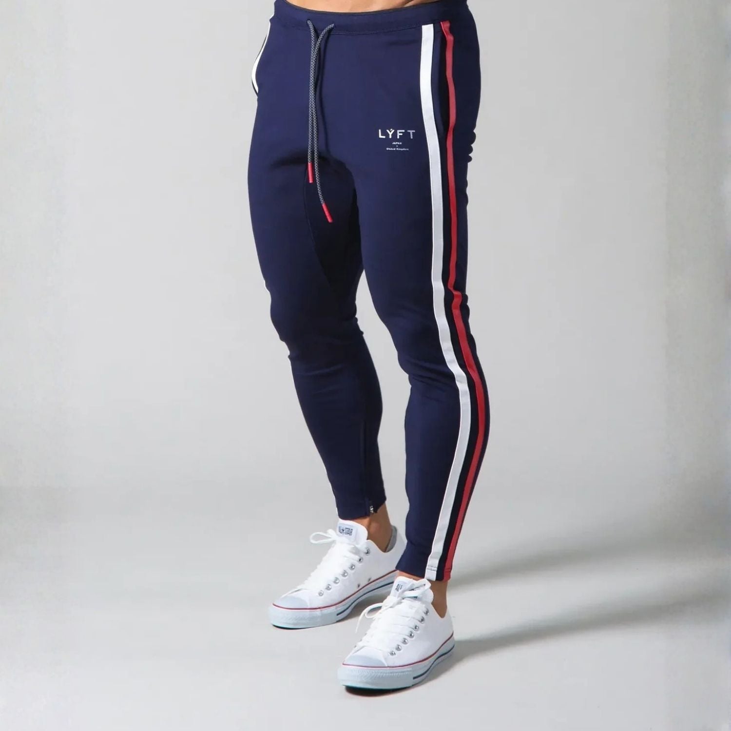 Designed for the modern man who moves between the gym, the streets, and social spaces with equal confidence, the Velocity Performance Jogger redefines athletic luxury. This isn't basic activewear—it's a precision-tailored piece featuring premium cotton-blend fleece with four-way stretch technology that moves with your body's every motion. The sophisticated navy base anchors bold contrast striping in crisp white and athletic red, creating clean visual lines that elongate the leg and add dynamic energy to your silhouette. Minimalist "LYFT" branding at the thigh maintains understated refinement, while the tapered fit with ribbed ankle cuffs delivers that coveted athletic-streetwear aesthetic that works everywhere.